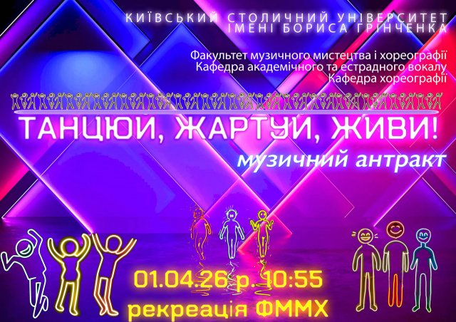 01 квітня 2026 року у межах мистецького проєкту «Музичний антракт» була презентована концертна програма «Танцюй, жартуй, живи!» за участі студентів ОПП «Інструментальне виконавство, «Сольний спів» та «Хореографія» Факультету музичного мистецтва і хореографії Київського столичного університету імені Бориса Грінченка.