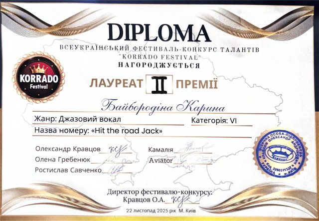 22.11.2025 р. в місті Київ відбувся Всеукраїнський фестиваль-конкурс талантів "Korrado Festival" здобувачі класу викладача Гузь Анастасії здобули перемоги у номінації “Джазовий вокал”!