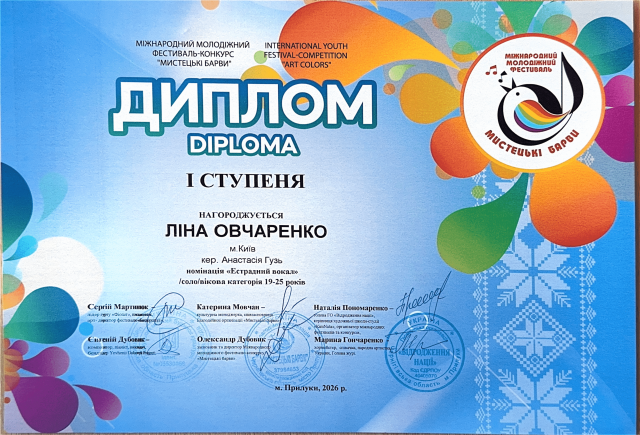Вітаємо з перемогою нашу студентку Ліну Овчаренко спеціальності «Музичне мистецтво» ОПП «Сольний спів», її викладача Гузь Анастасію Валеріївну, викладача кафедри академічного та естрадного вокалу, з отриманням Диплома І ступеня на Міжнародному молодіжному фестивалі-конкурсі «Мистецькі барви» у номінації «Естрадний вокал» (вікова категорія 19–25 років), м. Прилуки, 2026Бажаємо подальших успіхів і нових перемог!