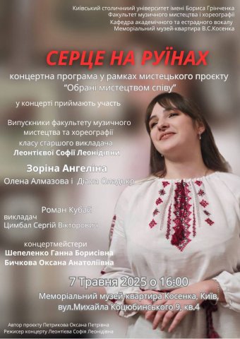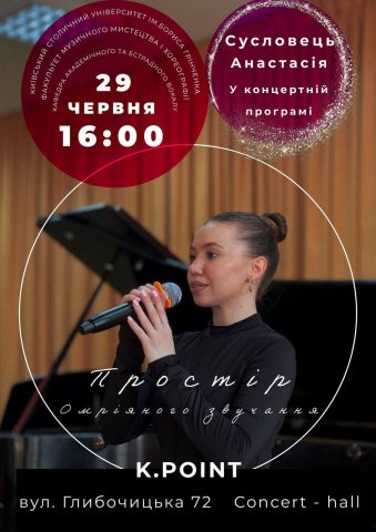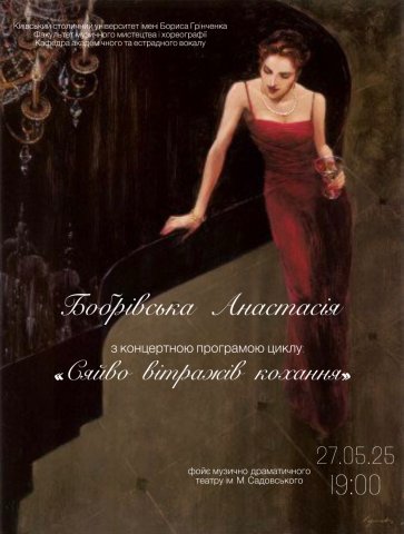 Впродовж травня-червня 2025 р. у рамках реалізації творчих проєктів здобувачі-магістранти спеціальності «Музичне мистецтво», ОПП «Сольний спів» Факультету музичного мистецтва і хореографії виступили із сольними концертами у різних культурно-мистецьких залах Києва, України, Німеччини, Швейцарії. Сольні вокальні програми виконали: Корнілевська А. (клас ст. викладача Ланіної Т.О.), Камаралі Р. (клас ст. викладача Гмиріної С.В.), Баранова М. (клас викладача Точкової С.С.), Сусловець А. (клас доцента Петрикової О.П.), Бобрівська А. (клас доцента Нагорної О.В.); Перевозна Г. (клас ст. викладача Яковенко В.Г.), Булавінова М. та Коваленко Г. (клас ст. викладача Макарової Е.В.), Зоріна А. (клас ст. викладача Леонтієвої С.Л.), Литвиненко В. (клас пофесора Тетері В.М.), Погребняк М. (клас доцента Процишиної О.Ю.),