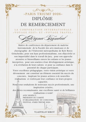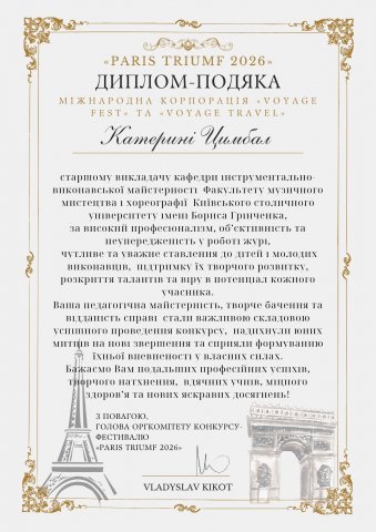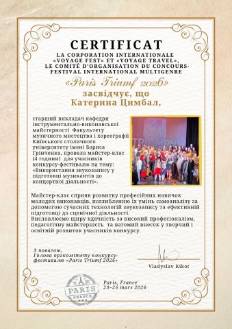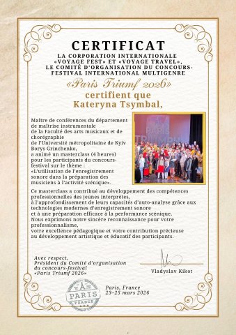 У період 23-25 березня 2026 року у Парижі (Франція) відбувся Міжнародний багатожанровий конкурс-фестиваль Paris Triumph 2026. До складу поважного журі була запрошена Катерина Цимбал, старший викладач кафедри інструментально-виконавської майстерності. У рамках проведення конкурсу-фестивалю Катерина Олександрівна провела майстер-клас для його учасників на тему: "Використання звукозапису у підготовці музикантів до концертної діяльності". Вітаємо колегу й бажаємо нових цікавих професійних подій!