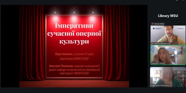 28 листопада 2025 року студентка 4 курсу ОП Інструментальне виконавства (фортепіано) Іваненко Марія разом із науковим керівником Романенко А.Р., кандидатом культурології, доцентом кафедри інструментально-виконавської майстерності, взяли участь у роботі VI Міжнародної науково-практичної конференції «Феномен культури постглобалізму: культурна демократизація, креативні простори та культурні політики» Маріупольського державного університету - презентували доповідь на тему: "Імперативи сучасної оперної культури: традиційне/перформативне, акустичне/електронне, академічне/народне". У ході дискусії Сабадаш Ю.С., доктор культурології, професор, голова редакційної колегії збірника, наголосила на потенціалі театральної сцени в контексті "говорити разом про сьогоднішнє через різні культурні досвіди".