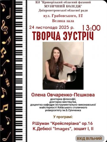 24 листопада 2025 року у Криворізькому обласному музичному коледжі відбувся сольний концерт докторки філософії, докторки мистецтва, доцентки кафедри інструментально-виконавської майстерності Овчаренко-Пєшкової Олени Сергіївни.