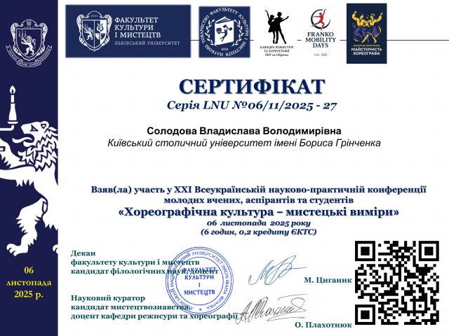 – Солодова Владислава Володимирівна (Київський столичний університет імені Бориса Грінченка);
