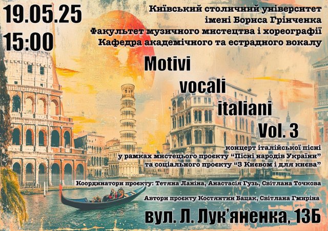 19 травня 2025 року студенти спеціальності «Хореографія», здобувачі 1 курсу взяли участь у святковому культурно-мистецькому проєкті «Motivi vocali italiani» присвяченому Дню Європи. У рамках соціального проєкту «З Києвом і для Києва» за адресою: вул. Л. Лук’яненка, 13Б.