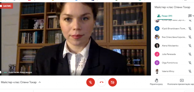 5-го квітня 2021 року на платформі GoogleMeet відбувся майстер-клас Олени Токар на тему «Вокальні та акторські тонкощі у виконанні оперних арій». Олена Токар – українська оперна співачка, сопрано, солістка Лейпцизької опери, володарка Гран-прі 2-го конкурсу вокалістів імені Бориса Гмирі (Київ 2008) та першої премії 61-го музичного конкурсу «ARD-Musikwettbewrb» (Мюнхен, 2012).