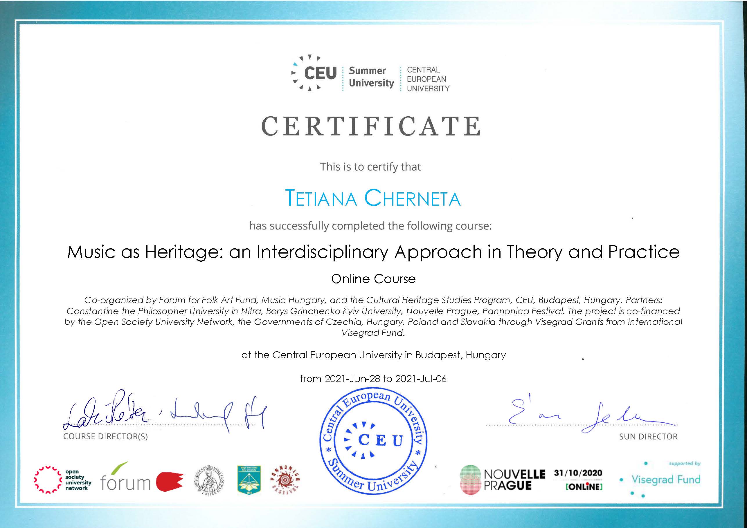 Міжнародний курс був справді мультинаціональним і об’єднав музикознавців, етномузикологів, викладачів, музичних менеджерів з Угорщини, Словаччини, Румунії, Великобританії, Бельгії, Португалії, Хорватії, Канади, Зімбабве, Індії, Пакистану, США й України. Отриманий Тетяною Чернетою на підставі створення і публічного захисту індивідуального проєкту сертифікат має логотип нашого університету.