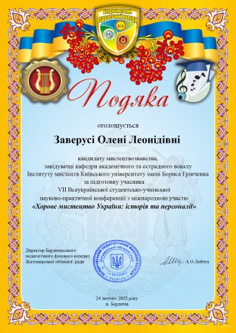 24 лютого 2022 р. відбулась VІІ Всеукраїнська студентсько-учнівська науково-практична конференція «Хорове мистецтво України: історія та персоналії» (м.Бердичів), у якій прийняли участь здобувачі освіти  Інституту мистецтв Христенко Богдан (4 курс ММ), Лозіцька Анастасія (3 курс ММ) - керівник  Олена Заверуха, завідувач кафедри академічного та естрадного вокалу, кандидат мистецтвознавства та Сусловець Анастасія (2 курс СС) - керівник Юлія Савченко-Шлапак, викладач кафедри академічного та естрадного вокалу.