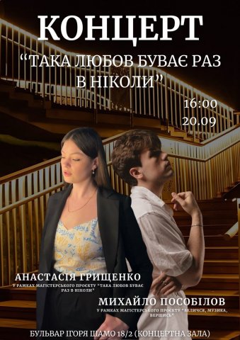 20 вересня 2024 року в актовій залі корпусу №2, бульвар І. Шамо 18/2, відбувся концерт під назвою «Така любов буває раз в ніколи» в рамках магістерського проєкту Анастасії Грищенко «Така любов буває раз в ніколи» та магістерського проєкту Михайла Пособілова «Величся, музика, вершись».