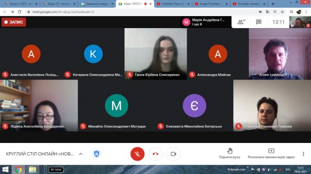 У ході зустрічі розглядалися питання щодо новаторства фортепіанної музики Сергія Прокоф’єва, драматизації сонатної форми у його пізніх сонатах (Артем Ляхович, кандидат мистецтвознавства, доцент кафедри виконавських дисциплін № 1 Київської муніципальної академії музики імені Р.М. Глієра), загального драматургічного контексту його сонат № 6, 7 та 8 (Ганна Слюсаренко, студентка 2 курсу спеціальності «Музичне мистецтво», (науковий керівник А.Р. Романенко), нових горизонтів та можливостей розвитку виконавського мистецтва (на прикладі перекладень фортепіанних творів для бандури та баяна/акордеона композиторів К. Дебюссі, Ф. Ліста та М. Мусоргського) (Богдан Христенко та Олександра Майсак, студенти 3 курсу спеціальності «Музичне мистецтво», науковий керівник С.П. Гумінюк)). У дискусії брали участь викладачі, студенти, магістранти та аспіранти Інституту мистецтв.