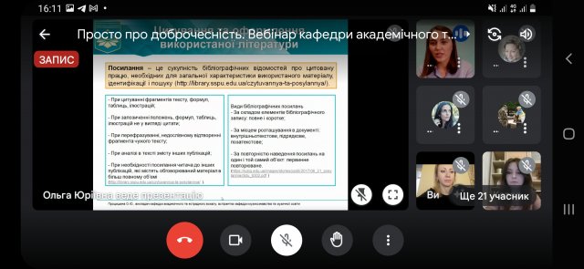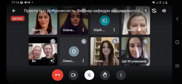 Захід був спрямований на формування знань з академічної доброчесності у студентів 1 – 4 курсів спеціальності Музичне мистецтво (Сольний спів). До зустрічі були залучені викладачі та концертмейстери кафедри. У завершенні зустрічі відбулося активне обговорення окреслених питань, що засвідчило великий інтерес учасників до тематики даного вебінару.