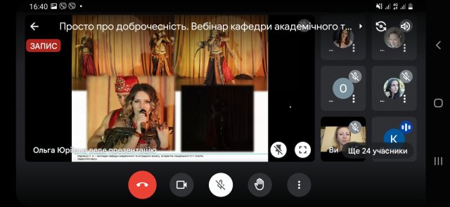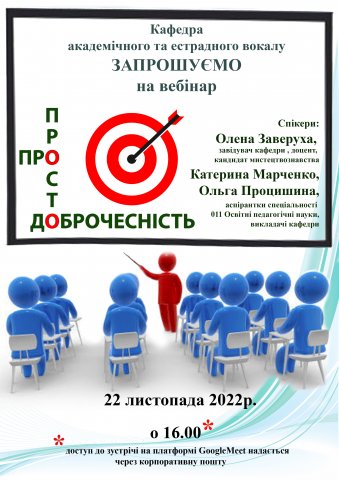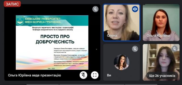 22 листопада 2022 року відбувся вебінар кафедри академічного та естрадного вокалу Факультету музичного мистецтва і хореографії Київського університету імені Бориса Грінченка на тему: «Просто про доброчесність», . Координатори та спікери заходу: Заверуха Олена Леонідівна, завідувач кафедри, доцент, кандидат мистецтвознавства, та Марченко Катерина Олександрівна, Процишина Ольга Юріївна, викладачі кафедри, аспіранти кафедри музикознавства та музичної освіти.