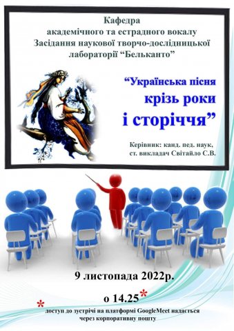 9 листопада 2022 року відбулось засідання наукової творчо-дослідницької лабораторії «Бельканто», присвячене Дню науки на тему: “Українська пісня крізь роки і століття” . У засіданні брали участь студенти та викладачі кафедри академічного та естрадного вокалу. Студенти виступили з доповідями і презентували українські пісні у виконанні українських ансамблів та вокально-хорових колективів.