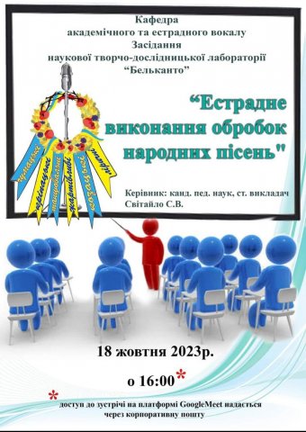 18 жовтня 2023 року відбулось засідання наукової творчо-дослідницької лабораторії «Бельканто» на тему: «Особливості обробки народних пісень в естрадному вокальному виконавстві».