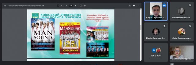 У доповідях було висвітлено особливості обробок українських народних пісень та їх виконання сучасними українськими гуртами, проаналізовано творчий стиль і деякі особливості виконання обробок українських народних пісень, заслухано аудіозаписи. Студенти висловили свою думку про виконавську манеру окремих колективів та запропонували включити в навчальний процес твори з репертуару цих колективів.