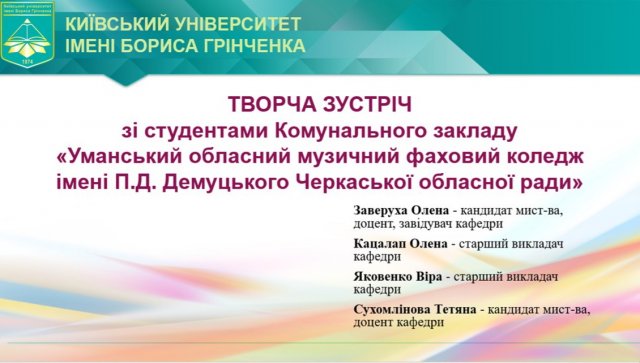 24 квітня 2023 року відбулася дистанційна творча зустріч зі здобувачами та викладачами Комунального закладу фахової передвищої освіти «Уманський обласний музичний фаховий коледж ім. П. Д. Демуцького Черкаської обласної ради», яку провели викладачі кафедри академічного та естрадного вокалу Факультету музичного мистецтва і хореографії Київського університету імені Бориса Грінченка: завідувачка кафедри, к. мист-ва, доцентка О. Заверуха, к. мист-ва, доцентка Т. Сухомлінова, ст. викладачки О. Кацалап та В. Яковенко, яка, власне, і виступила ініціатором проведення даного заходу.