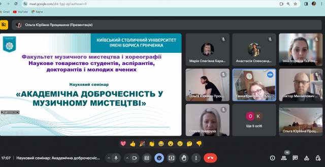 27 березня 2024 року Науковим товариством студентів, аспірантів, докторантів і молодих вчених Факультету музичного мистецтва і хореографії Київського столичного університету імені Бориса Грінченка було проведено науковий семінар для студентів та викладачів на тему «Академічна доброчесність в музичному мистецтві».