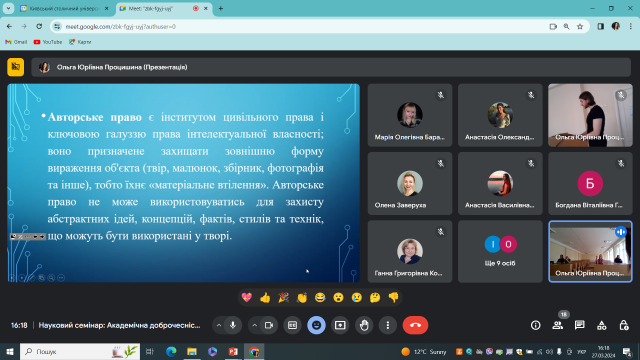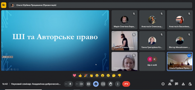 Під час заходу було розглянуто основні положення Закону України «Про освіту» щодо академічної доброчесності, дотримання її принципів здобувачами, науковими діячами. Доповідачем було висвітлено ключові поняття Закону України «Про авторське право та суміжні права», такі як: авторське право, суб’єкти авторського права, об’єкти авторського права, майнові та немайнові авторські права тощо. На науковому семінарі було окреслено особливості застосування результатів роботи штучного інтелекту в творчій, науковій та освітній діяльності, визначено, яким чином законодавство України регулює дане актуальне питання.