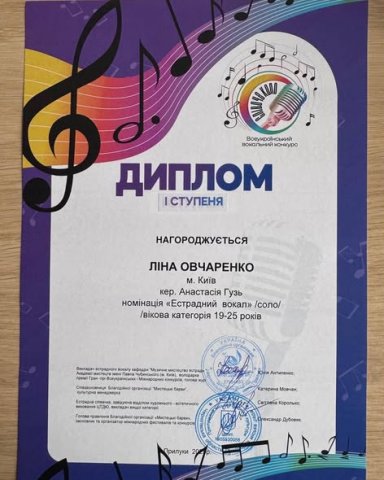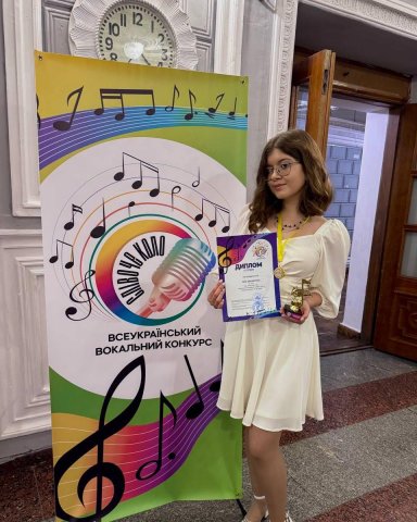 Перемога здобувачки у Всеукраїнському вокальному конкурсі «Співоче коло» Вітаємо студентку 2 курсу Ліну Овчаренко! 25 жовтня в місті Прилуки відбувся Всеукраїнський вокальний конкурс «Співоче коло», де Ліна здобула Диплом І ступеня у номінації “Естрадний спів”! Клас викладача — Анастасія Гузь Концертмейстер — Марина Шепета Бажаємо подальших перемог!