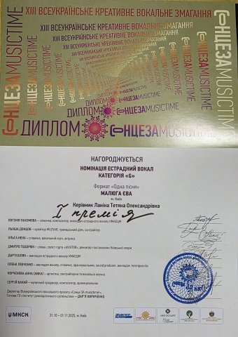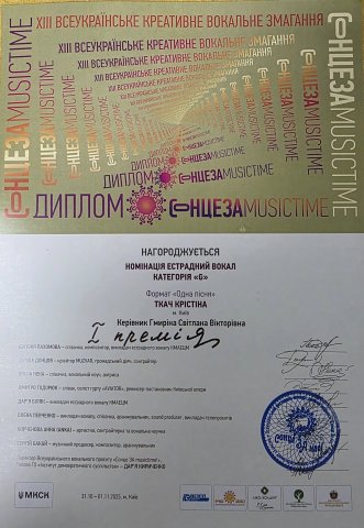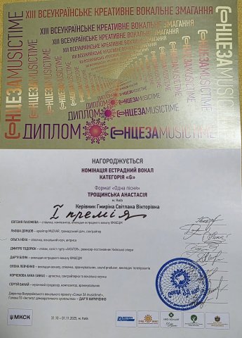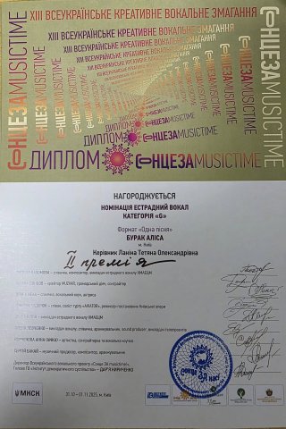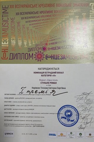 31.10.-01.11.2025 р. в місті Київ відбувся ХІІІ Всеукраїнський креативний вокальне змагання "Сонце за нас MUSIC TIME" здобувачі здобули перемоги у номінації “Естрадний вокал”!