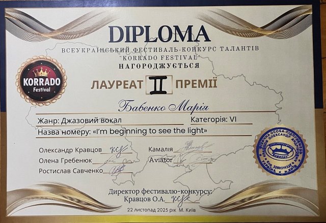 22.11.2025 р. в місті Київ відбувся Всеукраїнський фестиваль-конкурс талантів "Korrado Festival" здобувачі класу викладача Гузь Анастасії здобули перемоги у номінації “Джазовий вокал”!