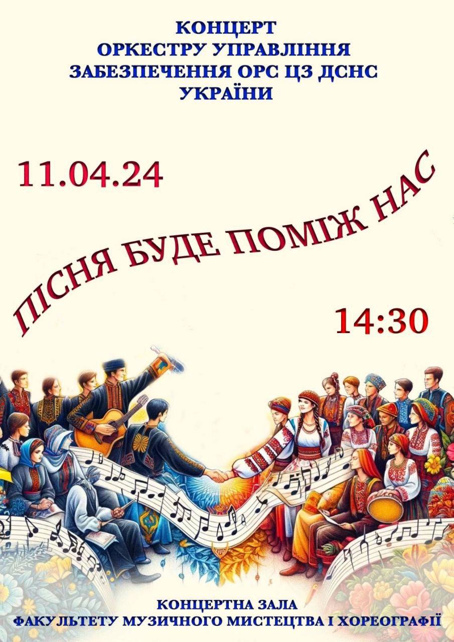 11.04.2024 на Факультеті музичного мистецтва і хореографії відбувся концерт оркестру Державної служби України з надзвичайних ситуацій з програмою «Пісня буде поміж нас», присвячена життю та творчості видатного українського композитора Володимира Івасюка. Начальник, художній керівник оркестру підполковник служби ЦЗ Руслан Симоненко, диригент Валерій Іванцов.