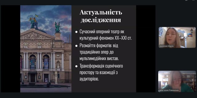 28 листопада 2025 року студентка 4 курсу ОП Інструментальне виконавства (фортепіано) Іваненко Марія разом із науковим керівником Романенко А.Р., кандидатом культурології, доцентом кафедри інструментально-виконавської майстерності, взяли участь у роботі VI Міжнародної науково-практичної конференції «Феномен культури постглобалізму: культурна демократизація, креативні простори та культурні політики» Маріупольського державного університету - презентували доповідь на тему: "Імперативи сучасної оперної культури: традиційне/перформативне, акустичне/електронне, академічне/народне". У ході дискусії Сабадаш Ю.С., доктор культурології, професор, голова редакційної колегії збірника, наголосила на потенціалі театральної сцени в контексті "говорити разом про сьогоднішнє через різні культурні досвіди".