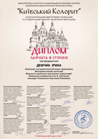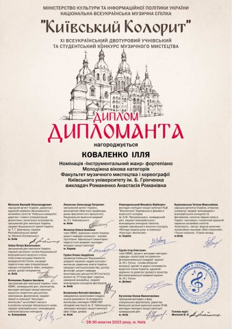 Вітаємо переможця та дипломантів XI Всеукраїнського двотурового учнівського та студентського конкурсу музичного мистецтва "Київський Колорит", 28-30 жовтня 2022, м. Київ (номінація "Фортепіано, соліст", вікова категорія "Молодіжна" ) :