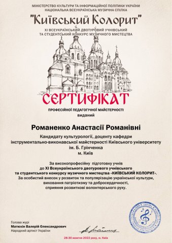 Клас Романенко Анастасії Романівни, кандидата культурології, доцента кафедри інструментально-виконавської майстерності Факультету музичного мистецтва і хореографії Київського університету імені Бориса Грінченка