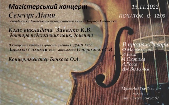 Спілкування з аудиторією під час "живого" концерту - це завжди надихає та мотивує, особливо під час війни. Ділимося з вами приємними миттєвостями магістерського концерту Семчук Ліани (клас доктора пед. наук, доцента Катерини Завалко) в музеї Лесі Українки. В концерті взяла участь також учениця ДМШ №12 Соломія Завалко.