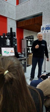 Заступник директора магазину «In-Jazz» Борис Трегуб підготував цікаву презентацію про природу звуку, звукове обладнання та мікрофони різних сімейств. Студенти мали можливість порівняти звучання динамічних та конденсаторних мікрофонів різних характеристик та цінових категорій, визначитись в пріоритетах придбання звукової техніки.