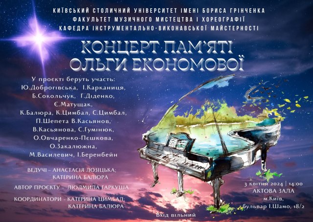 Концерт, присвячений пам'яті чудової піаністки, видатного педагога, старшого викладача кафедри інструментально-виконавської майстерності Ольги Економової