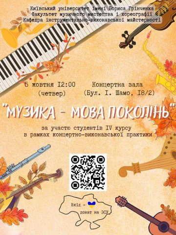 05 жовтня 2023 року у концертній залі Факультету музичного мистецтва і хореографії відбувся звітний концерт "Музика - мова поколінь" за підсумками концертно-виконавської практики здобувачів 4 курсу груп ІВОб-1-20-4.0д та ІВФб-1-20-4.0д (керівник практики - Балюра К.О., викладач кафедри інструментально-виконавської майстерності).