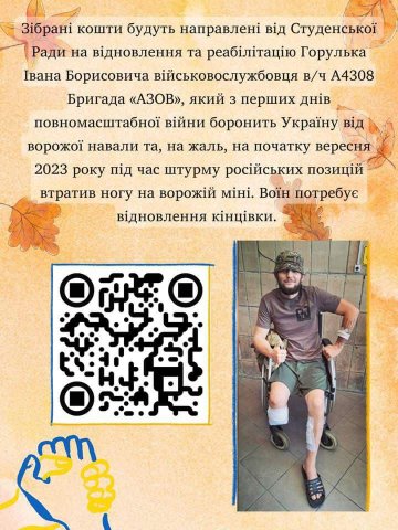 Концертна програма відбулась з благодійною метою: зібрані кошти перераховані від Ради студентського самоврядування Факультету на відновлення та реабілітацію Горулька Івана Борисовича, військовослужбовця в/ч А4308 Бригада «АЗОВ».