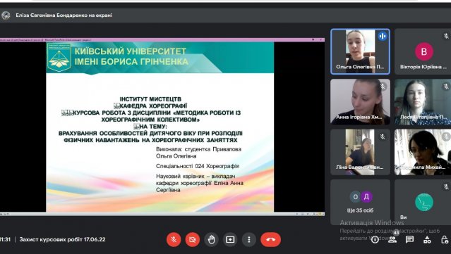 - дискусійна платформа наукового гуртка в рамках захисту курсових робіт студентів 3 курсу спеціальності 024 Хореографія з Методики роботи з хореографічним колективом (17.06.2022).