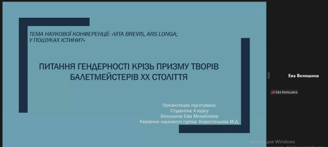 - онлайн дискусійна платформа наукового гуртка кафедри хореографії в рамках Всеукраїнської науково-практичної конференції (з міжнародною участю) «Мистецтво танцю і хореографічна освіта: досвід, тенденції, перспективи» (29.04.2022 ).