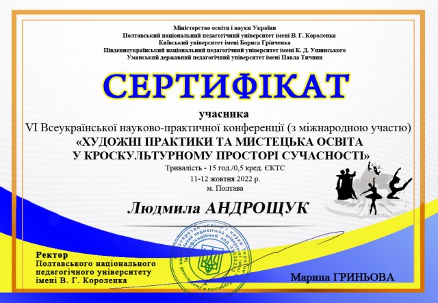 11-12 жовтня 2022 року на базі кафедри хореографії Полтавського національного педагогічного університету імені В. Г. Короленка відбулась Всеукраїнська науково-практична конференція (з міжнародною участю) «Художні практики та мистецька культура в кроскультурному просторі сучасності». Співорганізаторами заходу виступили Київський університет імені Бориса Грінченка, Південноукраїнський національний педагогічний університет К. Д. Ушинського, Уманський державний педагогічний університет імені Павла Тичини. Свої наукові, методичні та творчі доробки презентували понад 200 учасників з різних куточків України та науковці з Польщі та Китаю.