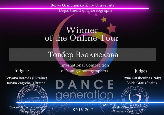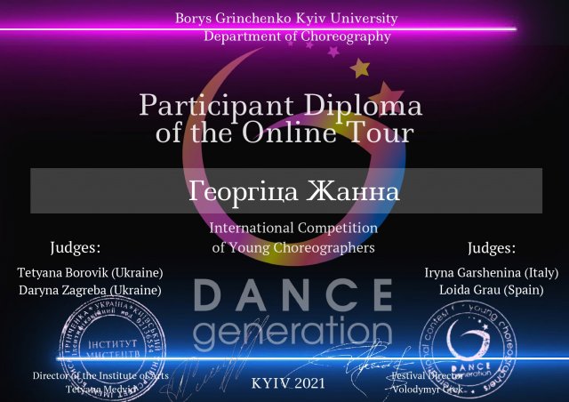 З 16 по 23 квітня 2021 року відбувся відбірковий онлайн тур міжнародного конкурсу молодих балетмейстерів «DANCE GENERATION 2021» Тур проводився з метою підвищення інтересу обдарованої молоді та сприяння розвитку хореографічної творчості в умовах пандемії та відсутності сценічних майданчиків для самореалізації творчого потенціалу хореографів у різних жанрах хореографічного мистецтва.