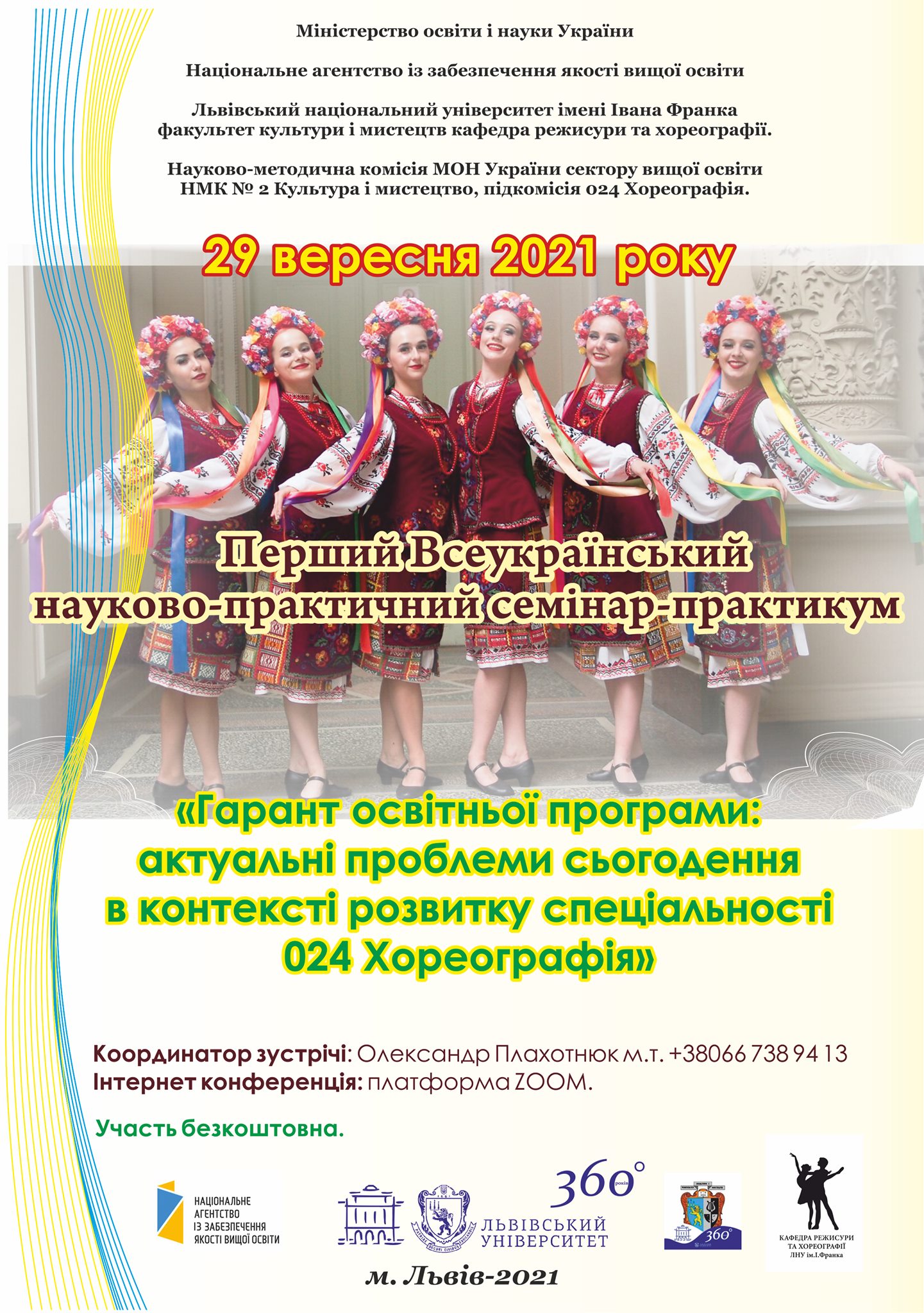 есня 2021 року директор Інституту мистецтв, доцент кафедри Медвідь Тетяна Анатоліївна та завідувач кафедри хореографії Андрощук Людмила Михайлівна взяли участь у Першому Всеукраїнському науково-практичному семінарі-практикумі «Гарант освітньої програми: актуальні проблеми сьогодення в контексті розвитку спеціальності 024 Хореографія» за участі закладів вищої освіти України, Національного агентства забезпечення якості вищої освіти, членів Галузевої експертної ради 02 «Культура і мистецтво», громадських організацій та роботодавців, громадських організацій.
