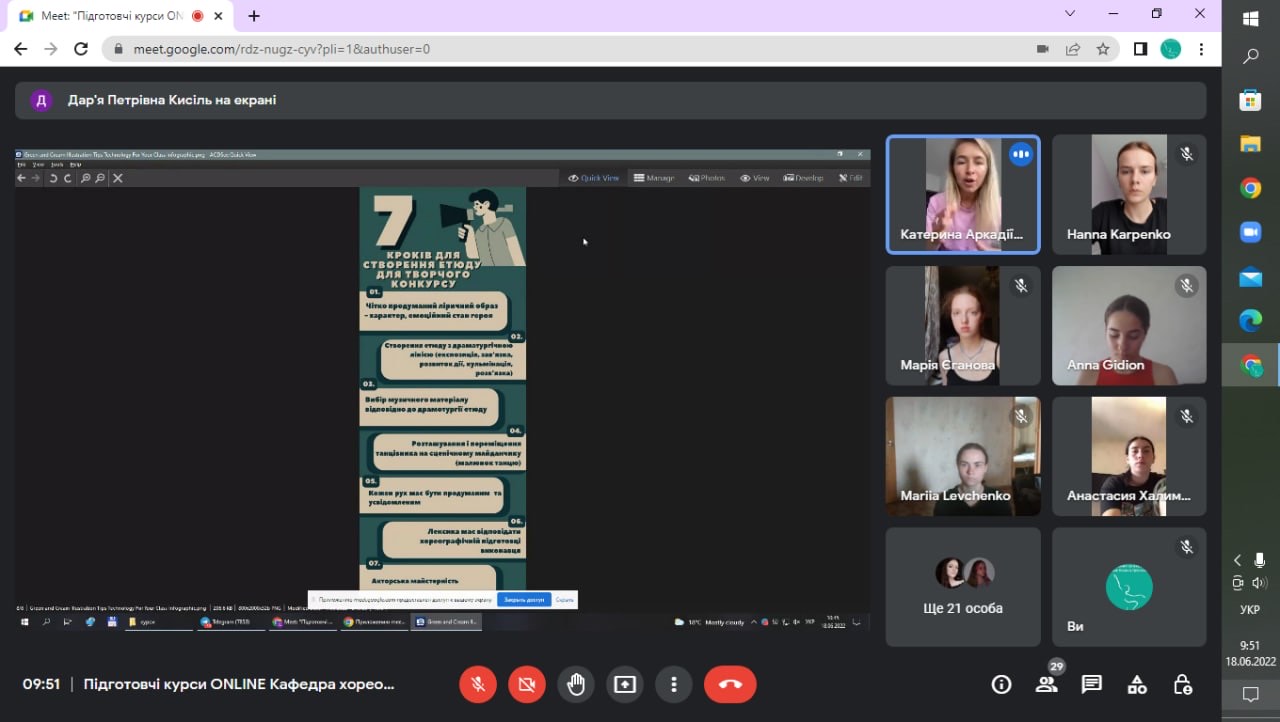 18.06.2022 р. відбулося вже шосте онлайн-заняття на тему «Етапи створення танцювального етюду. Частина 2» з модулю «Підготовчі курси для абітурієнтів» спеціальності 024 «Хореографія» Інституту мистецтв Київського університету імені Бориса Грінченка. Модераторами зустрічі були: кандидат мистецтвознавства, доцент кафедри - Лук‘яненко Катерина Аркадіївна, викладач кафедри - Кисіль Дар‘я Петрівна, концертмейстер кафедри - Пісоцька Лідія Василівна та студентка 1 курсу - Сірченко-Ваксман Єва. На занятті абітурієнти продовжили знайомитися з принципами створення танцювального етюду, а саме, в рамках сучасної хореографії. Катерина Аркадіївна та Дар‘я Петрівна пояснили та проаналізували поняття драматургії номеру та надали чітку характеристику усіх 5 складових (експозиція, зав‘язка, розвиток дії, кульмінація, розв‘язка). Спілкувались про сюжетну та безсюжетно хореографію, виокремлювали їх спільні та відмінні риси. Сірченко-Ваксман Єва, на своєму прикладі, продемонструвала етюд у стилістиці сучасного танцю модерн. На завершення заняття, Лідія Василівна висловила свої рекомендації щодо правильного підбору музичного матеріалу. Викладачі з задоволенням відповідали на питання абітурієнтів, а їх, повірте, було багато.