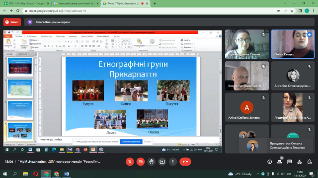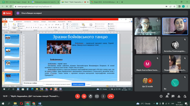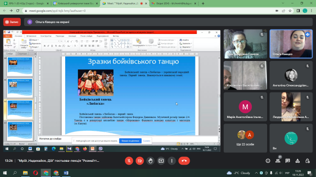 18 листопада 2022 року в рамках проекту «Мрій, Надихайся, Дій!» відбулась гостьова лекція в онлайн форматі на тему «Розмаїття прикарпатського краю». Цікавий та ґрунтовний матеріал про особливості народної хореографії Прикарпаття надала кандидат мистецтвознавства, старший викладач кафедри сценічного мистецтва і хореографії Навчально- наукового інституту мистецтв Прикарпатського національного університету імені Василя Стефаника, керівник ансамблю танцю «Дивоцвіт», викладач- методист Фахового коледжу культури і мистецтв (м. Калуш), керівник ансамблю танцю «Мереживо» Квецко Ольга Ярославівна.