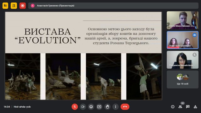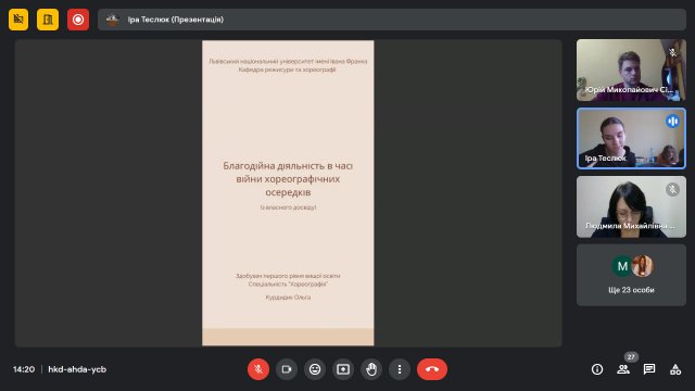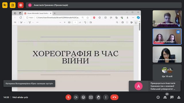 2 листопада 2023 року в Київському університеті імені Бориса Грінченка відбулось онлайн засідання круглого столу «Війна і танець: виклики сьогодення» в межах діяльності наукового студентського об’єднання кафедри хореографії DANCE COMMUNITY та вивчення дисципліни «Методологія і методи наукових досліджень у сфері хореографії» (викладач - кандидат педагогічних наук, доцент, завідувач кафедри хореографії Людмила Андрощук). У засіданні взяли участь викладачі та здобувачі вищої освіти Київського університету імені Бориса Грінченка, Полтавського національного педагогічного університету імені В.Г. Короленка, Львівського національного університету імені Івана Франка, Уманського державного педагогічного університету імені Павла Тичини.