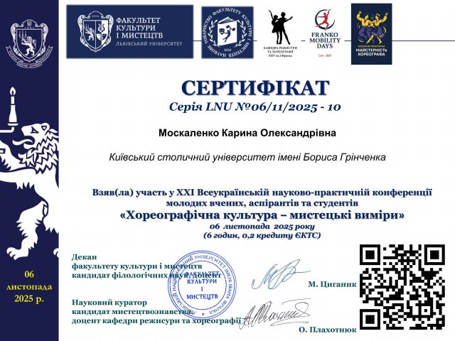З 01 жовтня по 06 листопада 2025 року студенти та викладачі кафедри хореографії стали учасниками Програми внутрішньої академічної мобільності – Освітньої програми першого (бакалаврського) рівня вищої освіти внутрішньої академічної мобільності здобувачів вищої освіти «Майстерність хореографа» галузі знань 02 Культура і мистецтво із спеціальності 024 Хореографія / В Культура, мистецтво та гуманітарні науки, спеціальність: В6 Перформативні мистецтва, спеціалізація: В6.03 Хореографічне мистецтво.