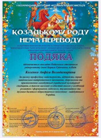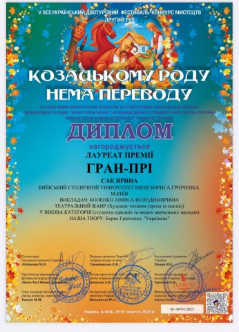 Вітаємо Сак Ярину, студентку 1 курсу, освітньо - професійної програми «Акторське мистецтво драматичного театру і кіно» Факультету музичного мистецтва і хореографії Київського столичного університету імені Бориса Грінченка із здобуттям ГРАН-ПРІ на V Всеукраїнському двотуровому фестивалі-конкурсі мистецтв «Козацькому роду нема переводу».